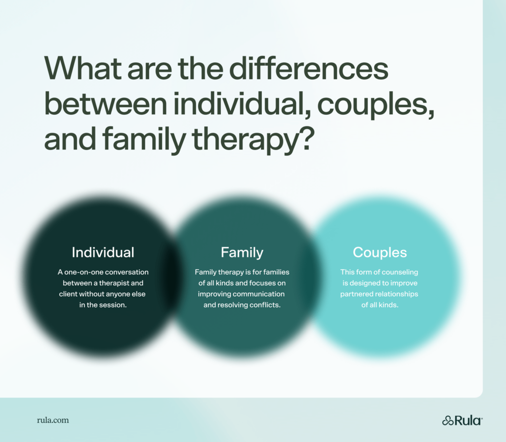 Individual, couples, and family therapy each focus on different dynamics and concerns. Many people engage in these different services at the same time.